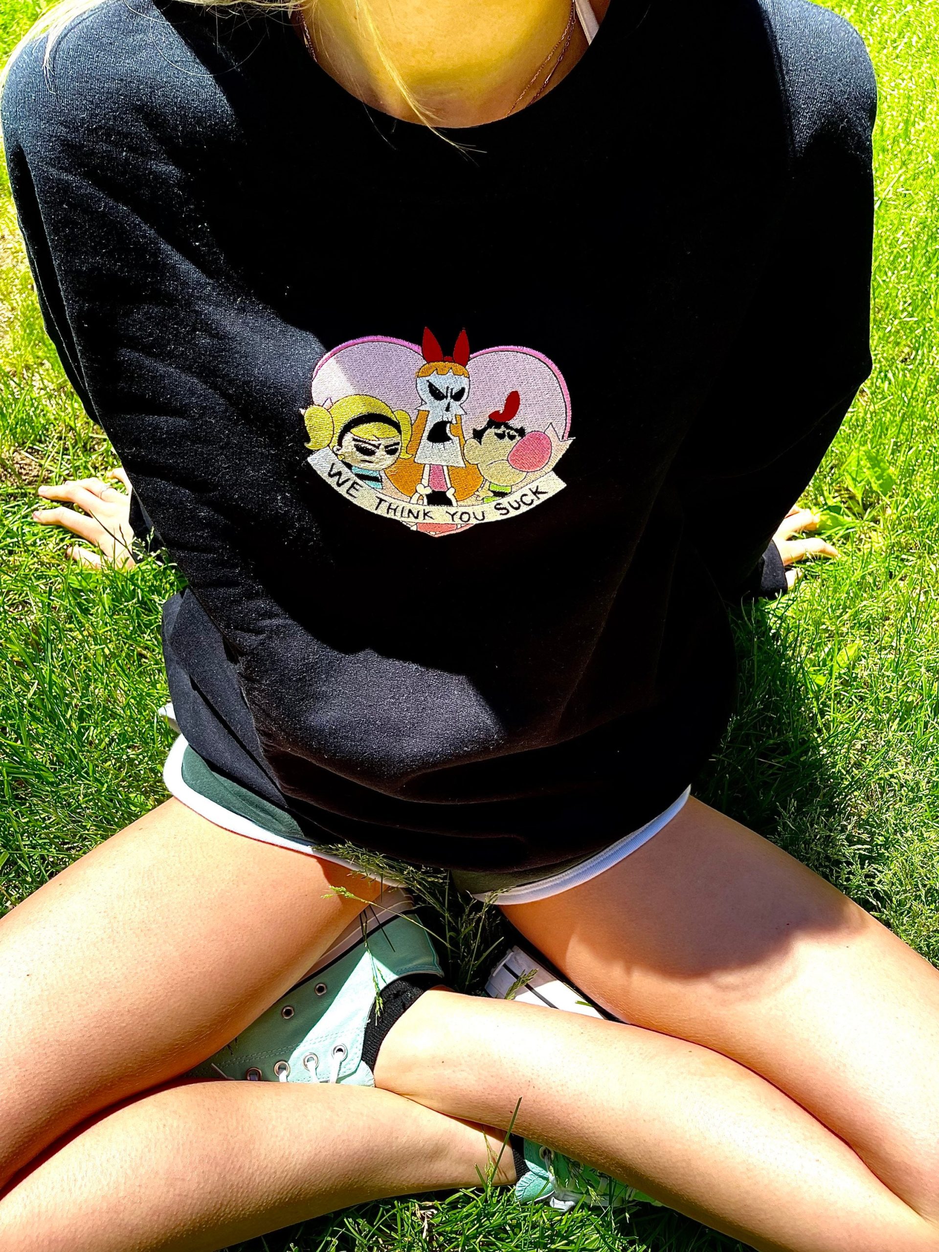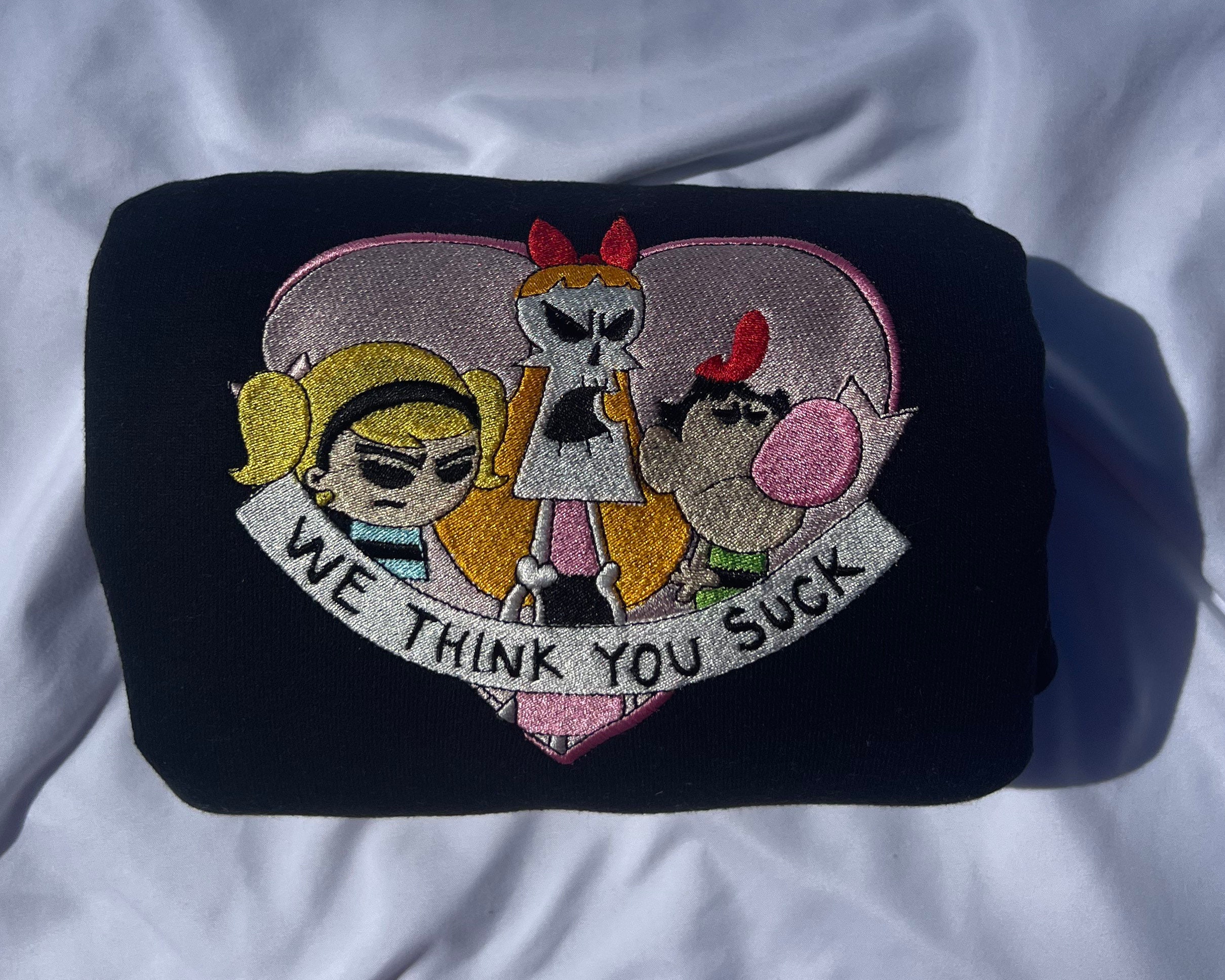 Introducing our Y2K Cute Embroidered Crewneck, a must-have for all fashion enthusiasts! This unique piece combines the nostalgia of the iconic Powerpuff Girls and Billy Mandy cartoons with a touch of humor. Made with premium quality materials, this crewneck is designed to provide ultimate comfort and style